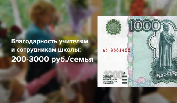 Выносим этот пункт в отдельный. По традиции учителей на выходе из школы принято благодарить. Масштаб благодарности, как правило, определяет актив класса, но не без участия классного руководителя. Символическими подарками ограничиваются не все. Расходы могут составить от 200 до 3000рублей с